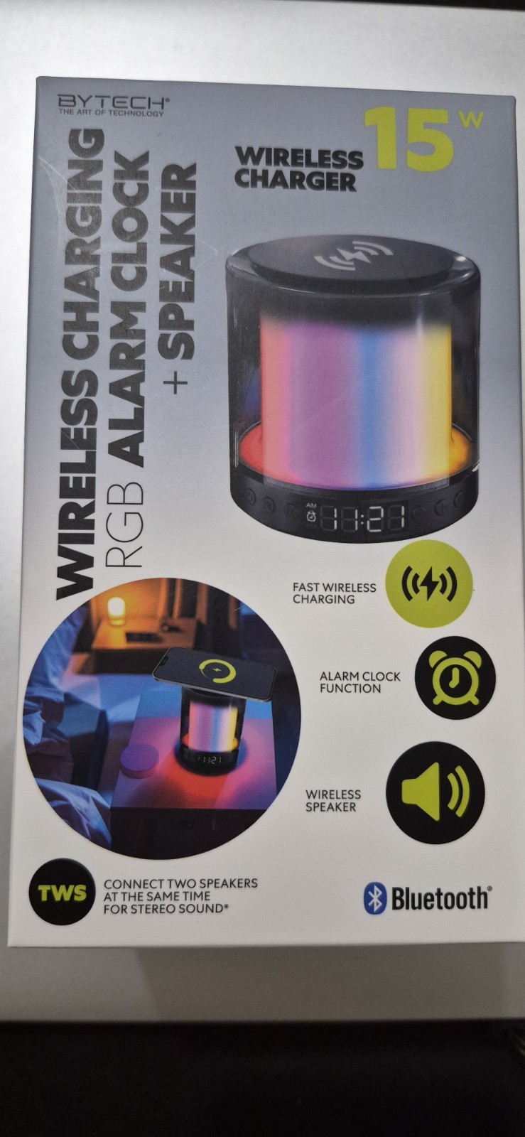The Bytech Wireless Charging RGB Alarm Clock + Bluetooth Speaker with LED Display is a versatile and modern smart speaker that offers a range of features. With its wireless connectivity and compatibility with universal devices, it allows for easy and seamless use. The alarm clock function, along with the Bluetooth speaker capabilities, makes it a convenient all-in-one device for any home. The sleek plastic design and vibrant LED display add a touch of style to the overall aesthetic. Whether you're streaming music or setting alarms, this smart speaker is a practical and stylish addition to any space.