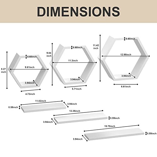 Wooden Hexagon Floating Shelves, Honey Comb Set of 6, White Hexagon Shelves