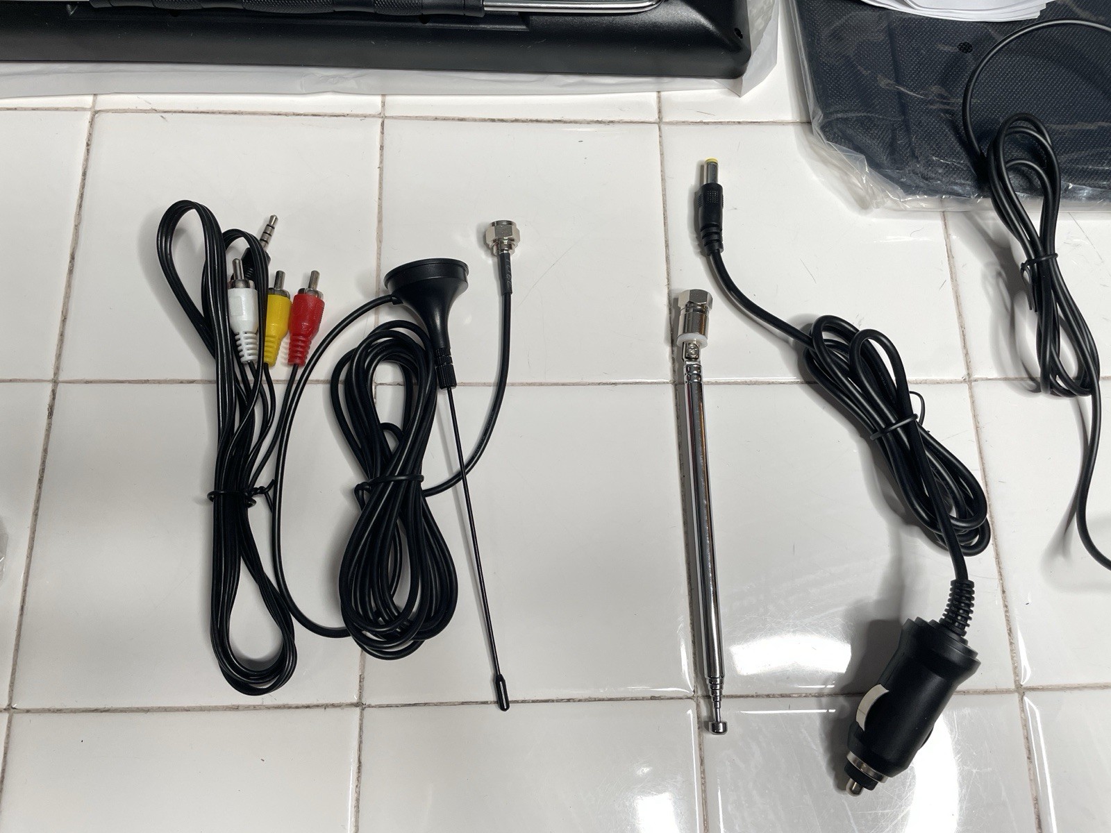 The only charger in the box is for a car, not a wall plug. You could get a replacement here on eBay if the car charger doesn’t work for you. No remote but is still fully functional with the buttons. I only charged it long enough to test it and show it on. Still in great condition. No scratches or wear to it. I bought this at a thrift store but this was either not used or very gently used. Includes headphones, 2 antennas, and an a/v cord.