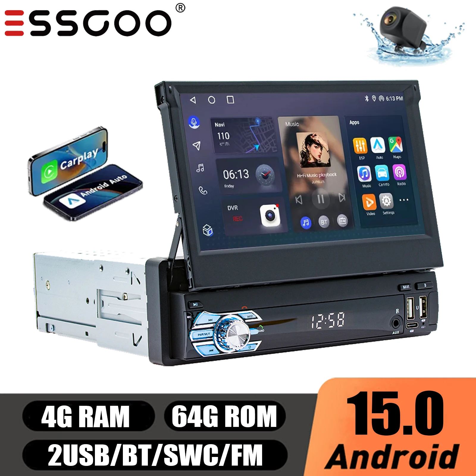 ESSGOO 7" Single 1 DIN Android 15 4G+64G Flip Out USB Touch Screen Apple Carplay Car Stereo Radio GPS Navi Head Unit WiFi+Camera $100.30