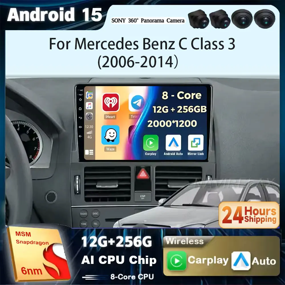 Android 15 Carplay Auto For Mercedes Benz C Class 3 W204 S204 2006 2007 2008 2009 - 2011 Multimedia Stereo Player GPS WIFI 360 $84.88