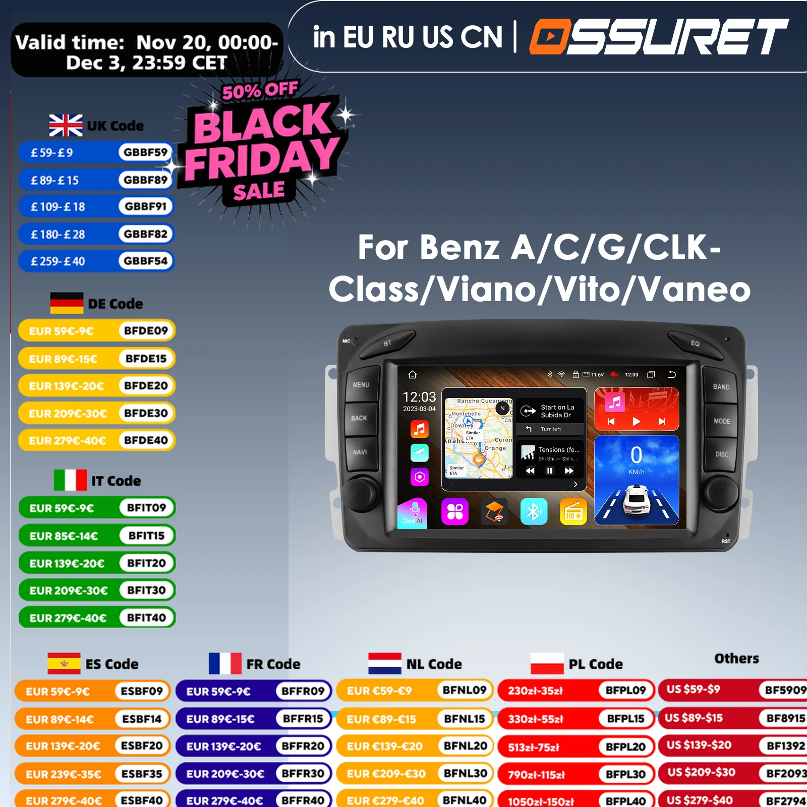 Octa-Core 2din Android 14 Radio Stereo Car Multimedia Player for Mercedes Benz W203 Vito W639 W168 Vaneo CLK W209 Navigation RDS $91.69