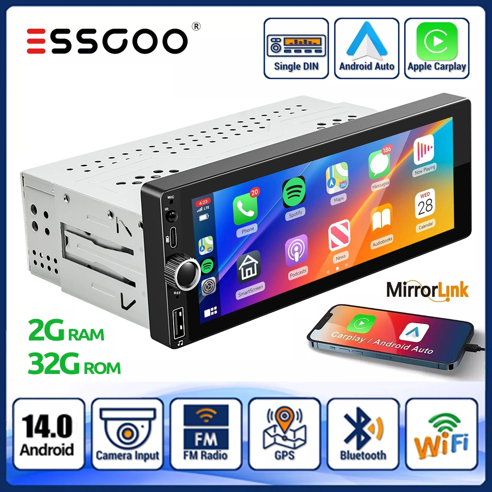 ESSGOO 6.86" Single 1Din Android 14 Car Stereo Wireless CarPlay Bluetooth FM Radio USB/Type-C Charging GPS Navi WiFi SWC+DVR&AHD $76.68
