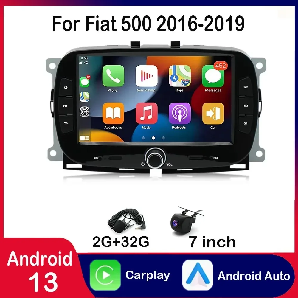 For 2016-2019 Fiat 500 Android 13 In-Car Navigation System 7in Built-in with CarPlay+Android Auto/2+32GB/AHD Camera/Microphone $126.03