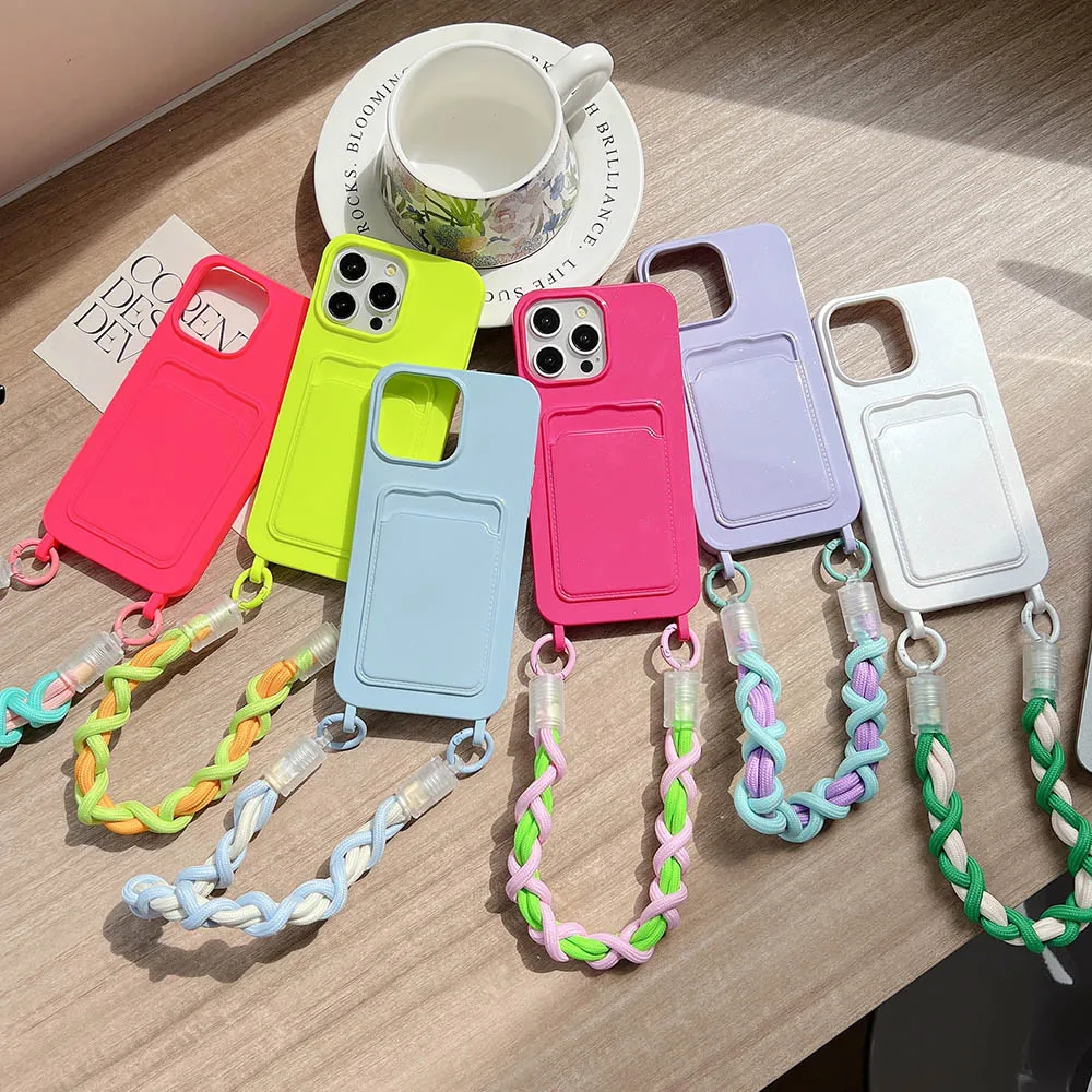 INS Colorful Weave Hand Rope Card Slot Bag Phone Back Case For iPhone 12 13 14 15 Pro Max 15 Plus Shockproof Soft Wallet Cover $7.00