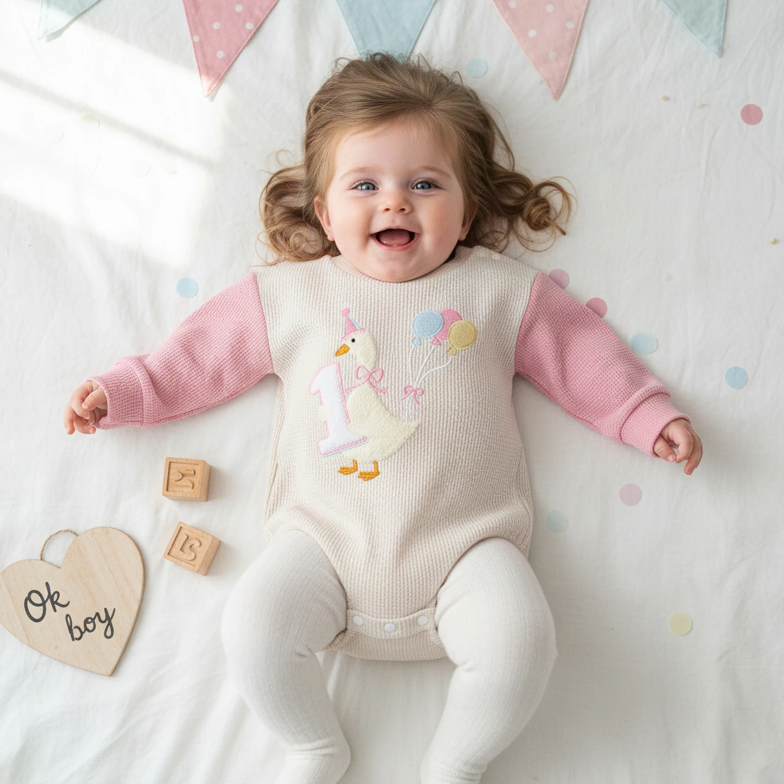 Baby Girl Birthday Rompers Comfortable Long Sleeve Round Neck Number Goose Embroidery Waffle Jumpsuit Birthday Gifts $4.41