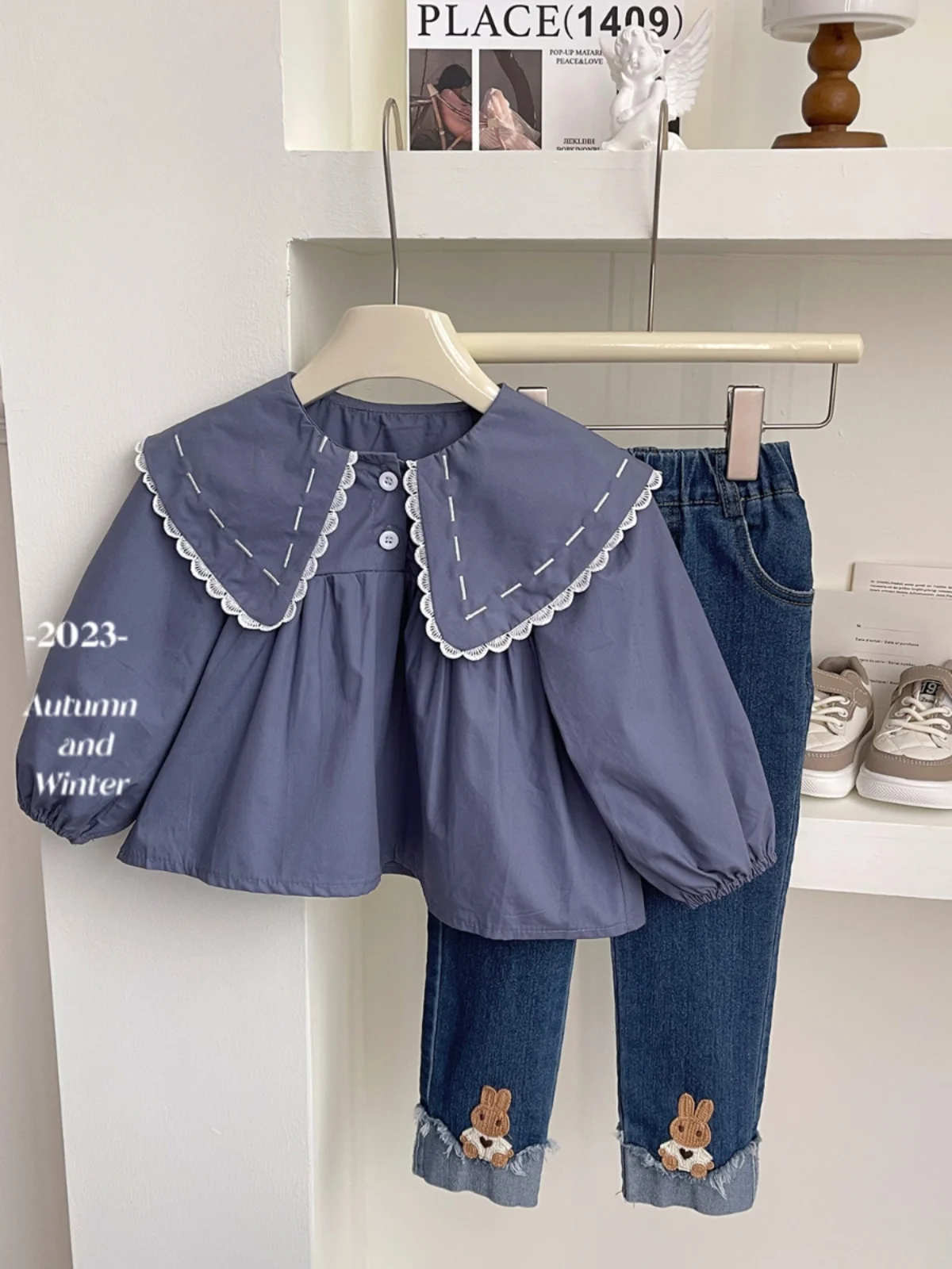 Cute Girl's Two-Piece irt Set Korean Sle Big Collar Baby Girl Spring Faion Soft Silk Material Lovely Little Girl Outfit $11.29