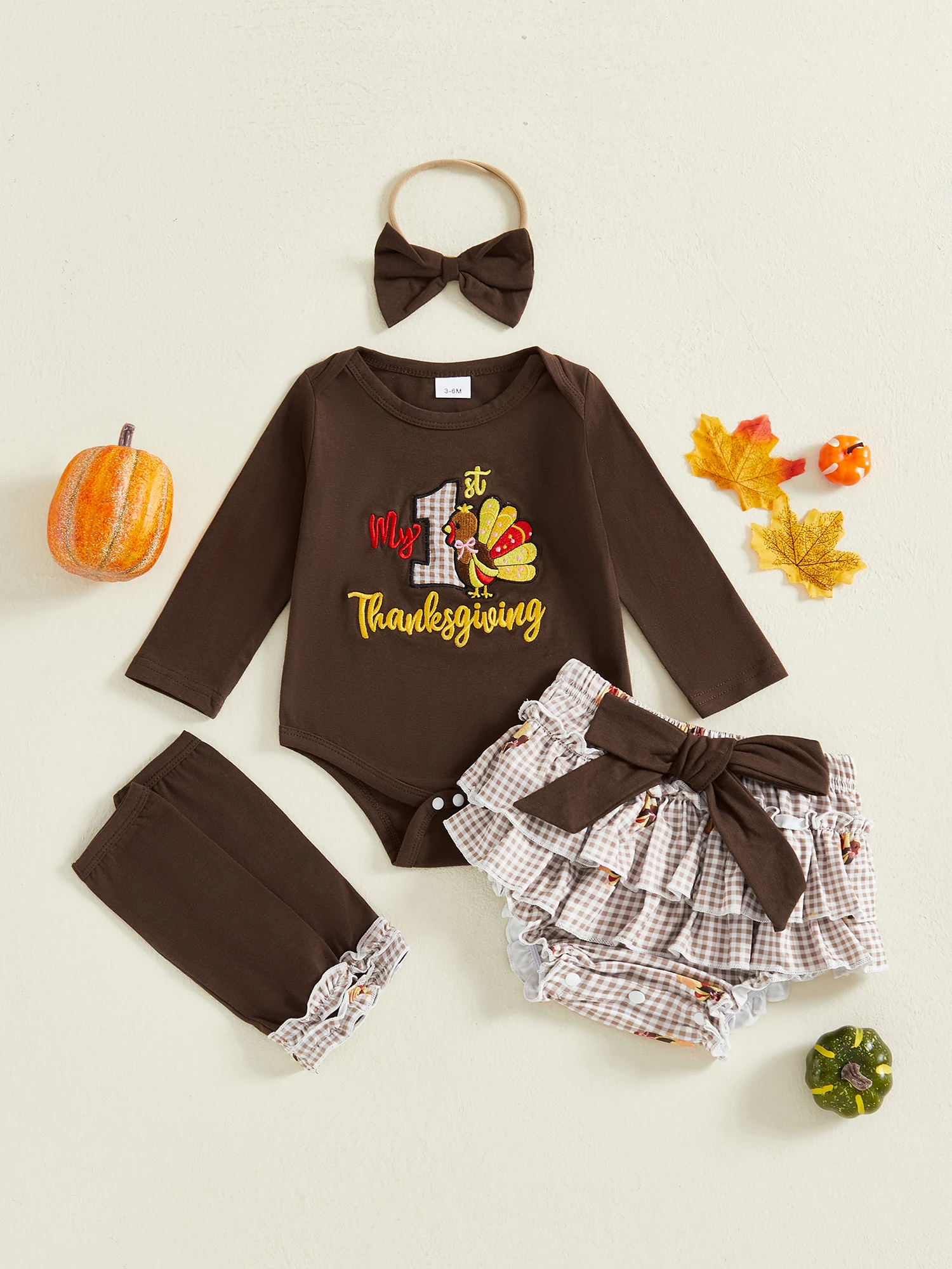 Thanksgiving Baby Girl Clothes Set with Long Sleeve Romper Layered Shorts Headband and Socks - 4 Piece Adorable Outfit $16.86