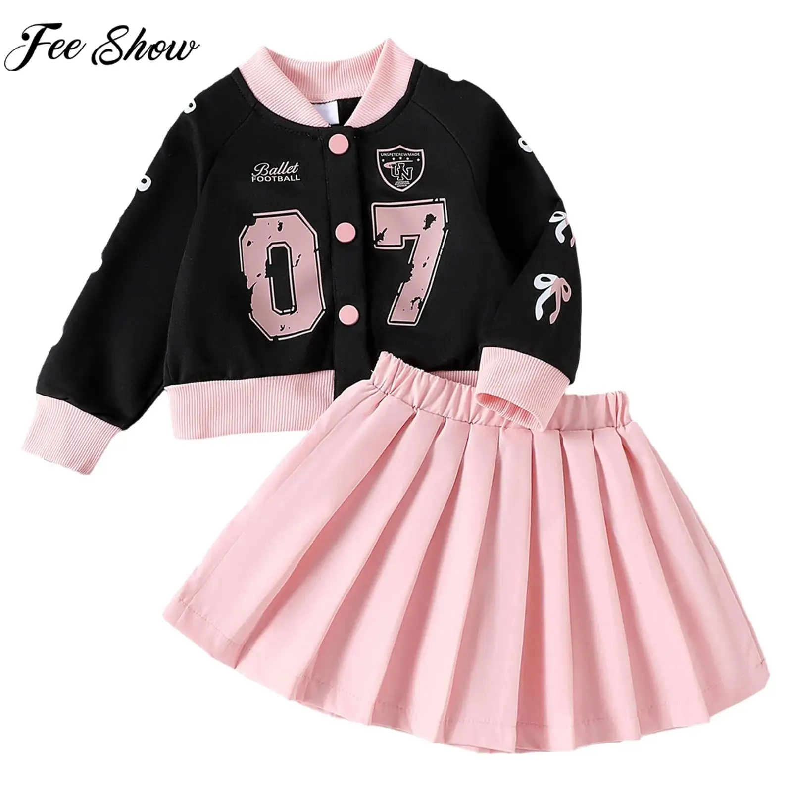 Baby Girls Spring Autumn Fashion Casual Outfit Long Sleeve Letter Bow Print Baseball Jacket with Pleated Skirt for Daily Party $10.04