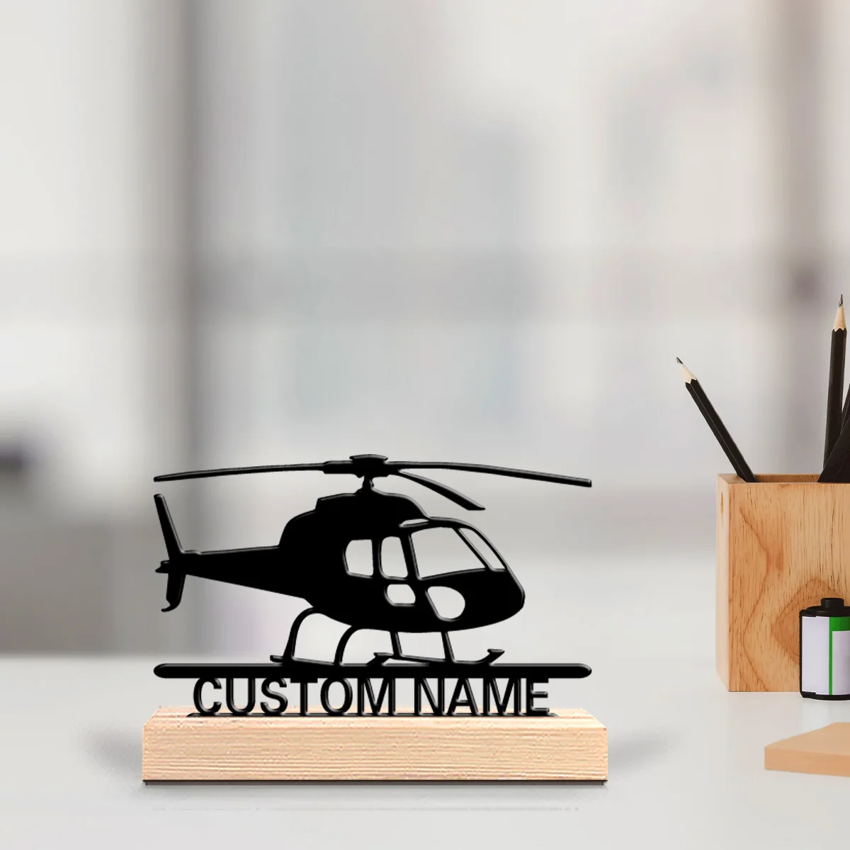 1pc Weird Personalized Custom Helicopter Metal Statues Modern Wooden Base Decor for Office, Living Room, Nature-Inspired $6.03