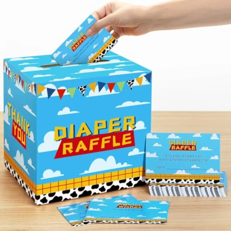 Boy Story Baby Shower Decorations Diaper Raffle Box with 50 Tickets CardsIt's A Boy Story Baby Shower Theme Game $18.19