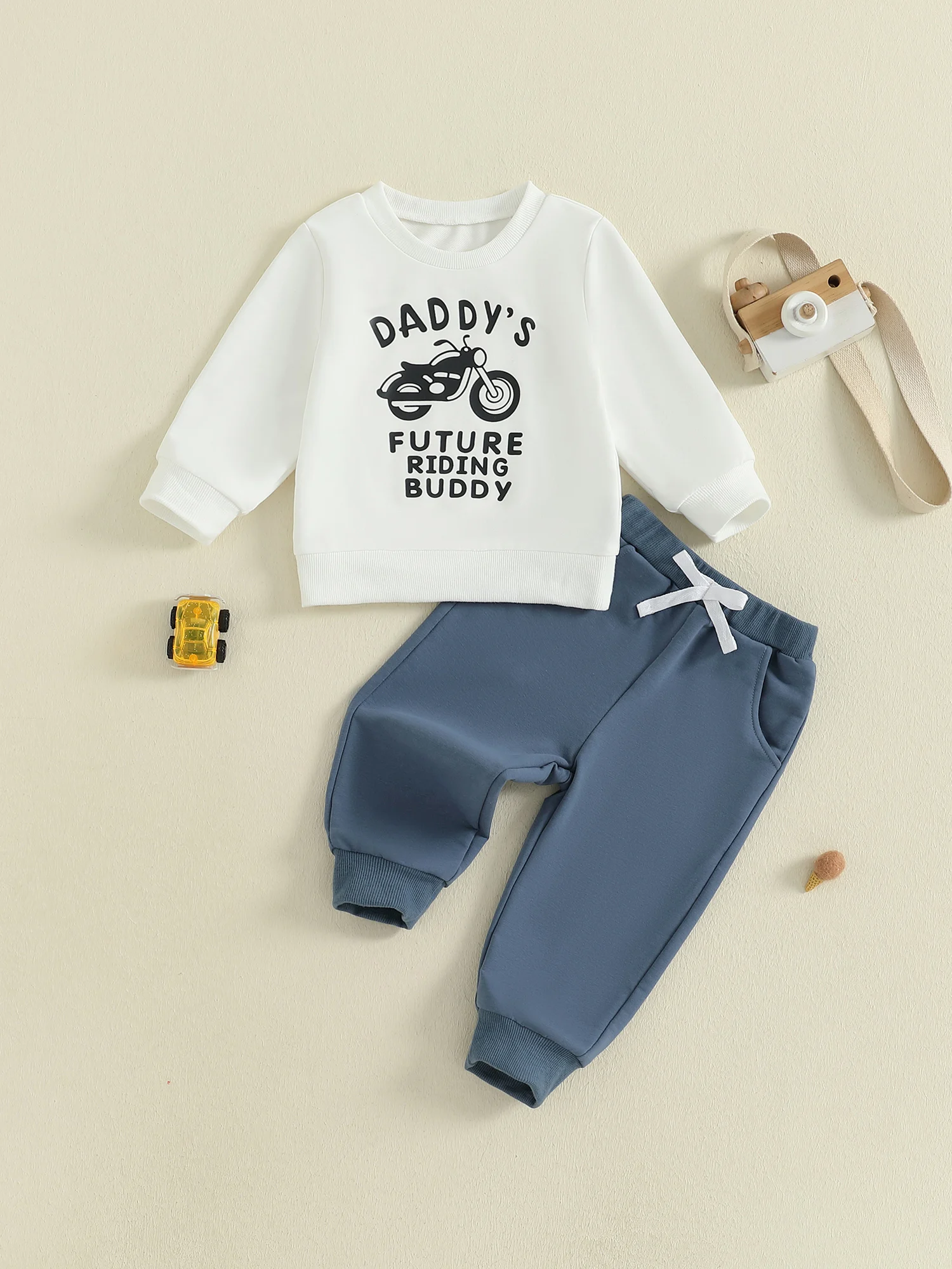 Baby Boy Fall Outfits Letter Motorcycle Print Long Sleeve Round Neck Pullover Elastic Waist Solid Pants 2 Pcs Set $15.35