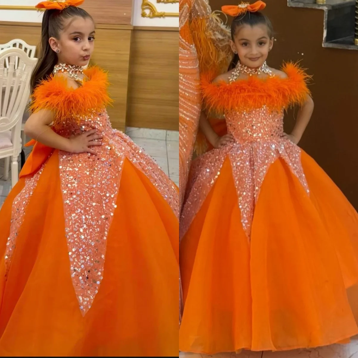 Orange Feather Girls Birthday Party Dresses Customized Crystal Flower Girl Dresses for Wedding Baby Girls Pageant Dress $103.53