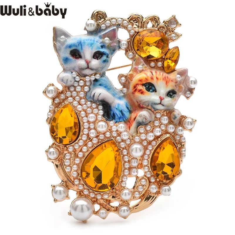 Wuli&baby Lovely 2 Cats Brooch Pins 4-color Enamel Royal Style Charming Cat Pets Brooches For Women's Clothes Badge Gifts $2.93