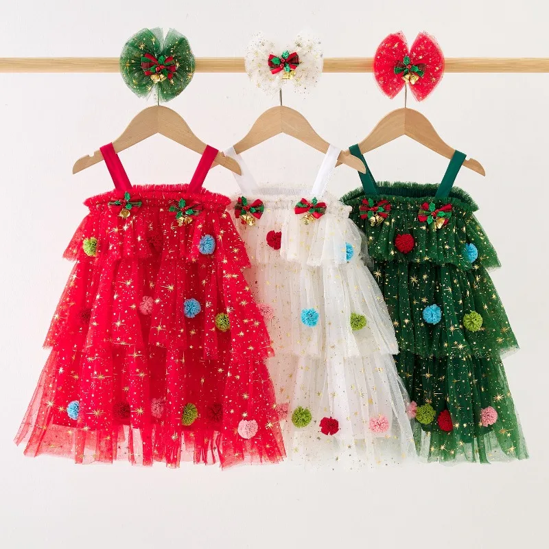 2024 Christmas KS Girls Princess Mesh Dress Kids Pretty Sequin Dresses Baby Cute Skirt Carnival Party Children Voile Dress Gifts $23.65