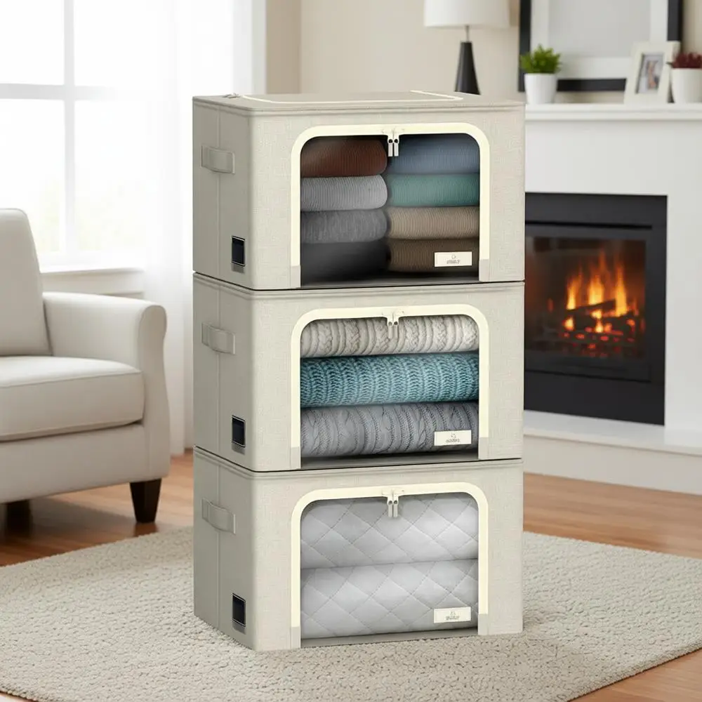 Stackable Metal Fabric Storage Bins with Clear View Window & Carry Handles for Clothes, Linen, and Bedding Organization $33.38