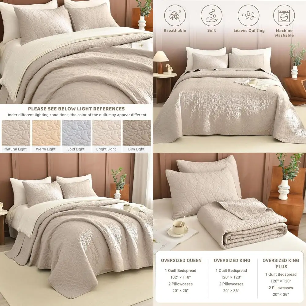 Extra Wide 100% Cotton King Quilt Set in Leaf Pattern, 128x120 Lightweight Coverlet for Cal King Bed, 3-Piece All-Season Bedding $163.46