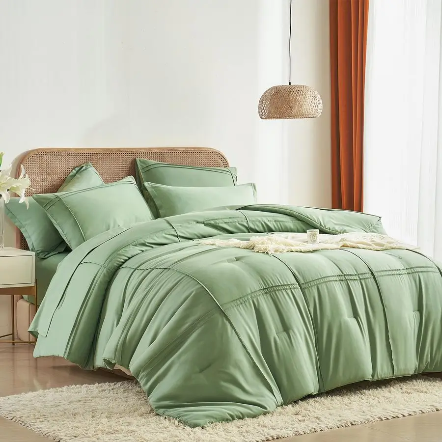 Queen Comforter Set 7 Piece Bed in a Bag,Grid Pinch Pleat Sage Green Bedding Set,Striped Textured Soft Microfiber Comforter with $46.75