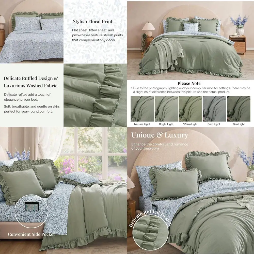 Sage Green 7-Piece Ruffle Comforter Set - Shabby Chic Queen Bedding with Floral Sheets & Pillowcases $39.72