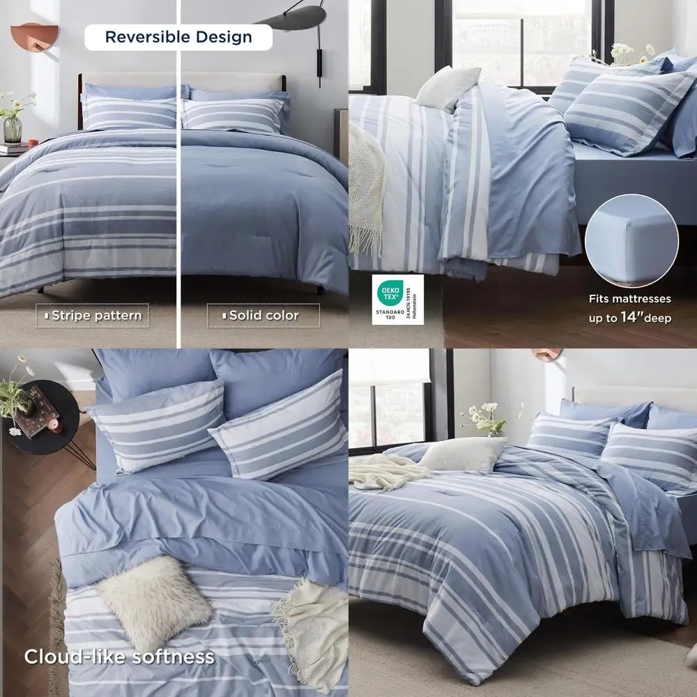 7-Piece Blue Striped Comforter Set, Reversible Bedding for All Seasons, Bed in a Bag with Sheets, Pillowcases & Shams $35.76