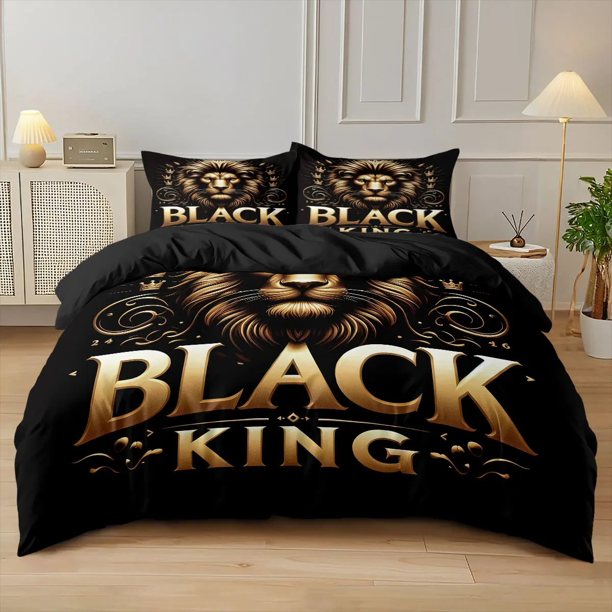 3pcs Lion Black King Printed Chipless Bedding Set Multi Size Bedroom Bedding Holiday Decor Machine Washable $14.48