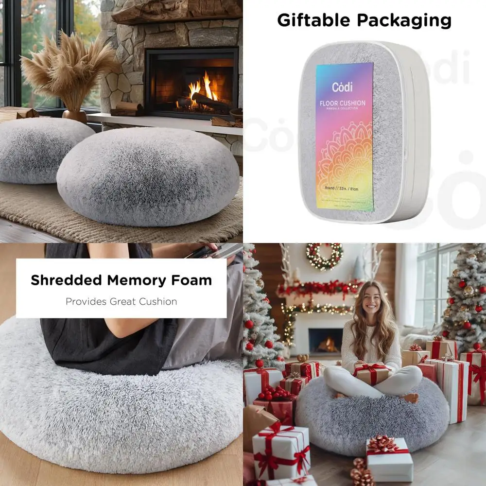 Luxurious Plush Faux Fur Floor Cushions, 32 Round for Comfortable Seating, Ideal for Living Rooms and Holiday Decor, Light Grey $78.38