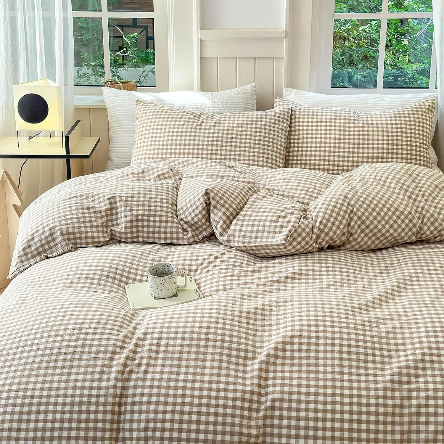 Tan Gingham Grid Duvet Cover Queen Set, 100% Washed Cotton with 2 Pillowcases, Farmhouse Checkered Bedding $95.88