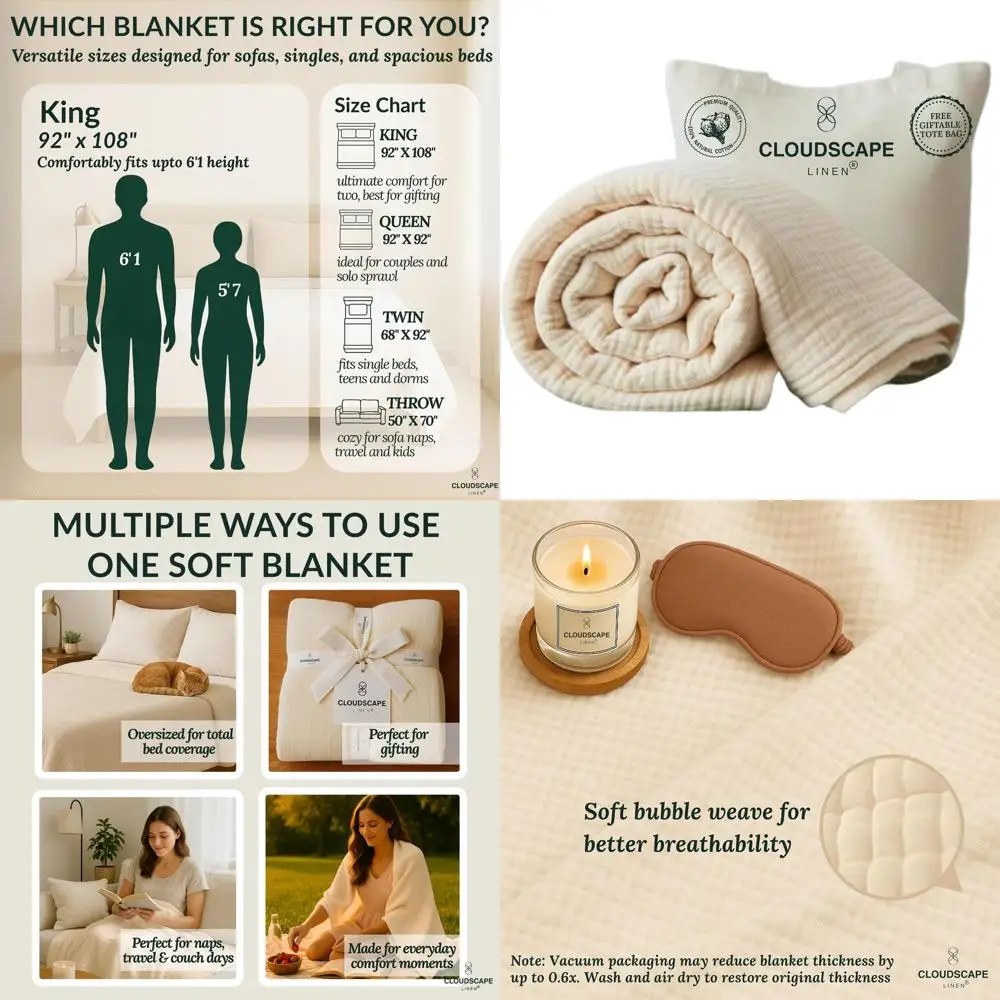 King Size 100% Cotton Muslin Oversized Blanket, 4-Layer Soft Gauze Quilt, Suitable for Calking Beds, All-Season Ivory Bedding $85.35