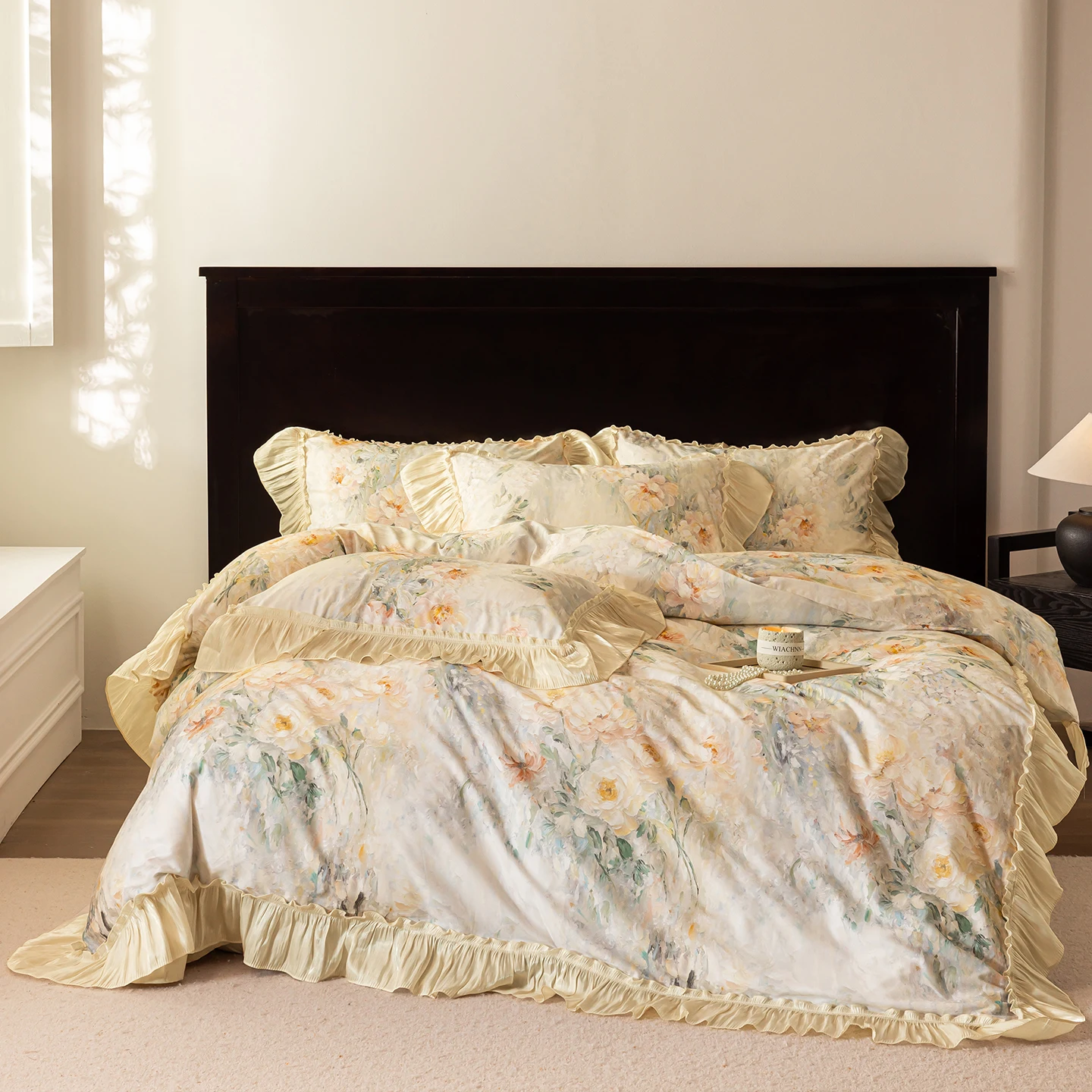 Flowers Printing Bedding Sets Luxury 100% Cotton Lace Princess Duvet Cover Sets Bed Sheet Pillowcases Home Textile $75.46