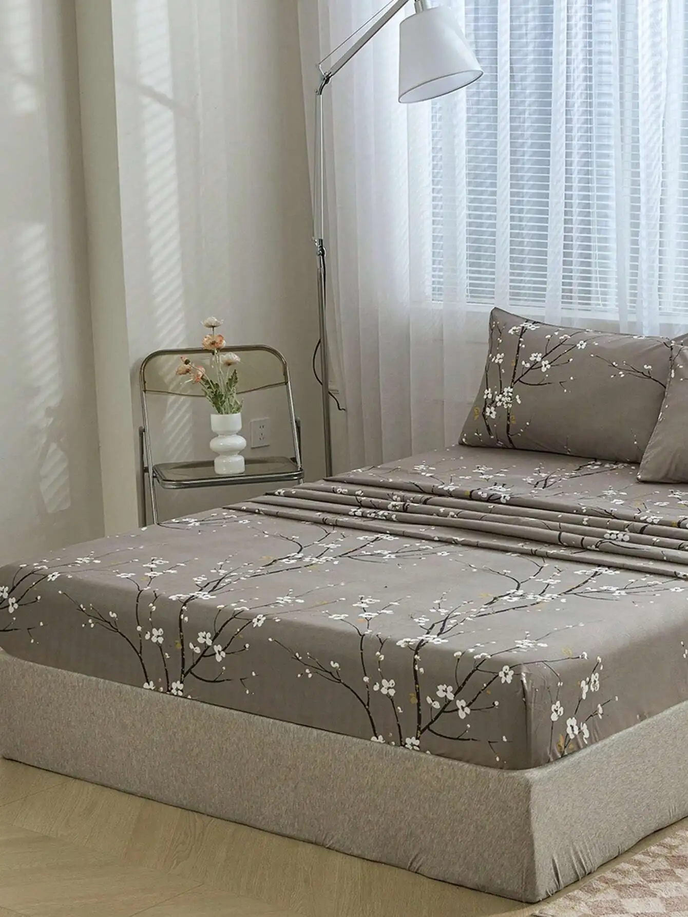 4PCS Gray Floral Microfiber Bedding Set Fitted Sheet Deep Pocket 11.8 Inch Soft Wrinkle-Free Hotel Style $36.44