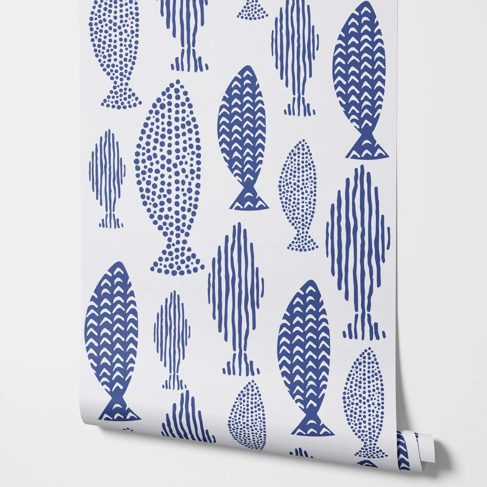 Abstract Geometry Blue Fish Wallpaper Peel and Stick.Blue Animal Wall Mural For Kids Room Decor,Self-adhesive Or Tradition Paper $19.33