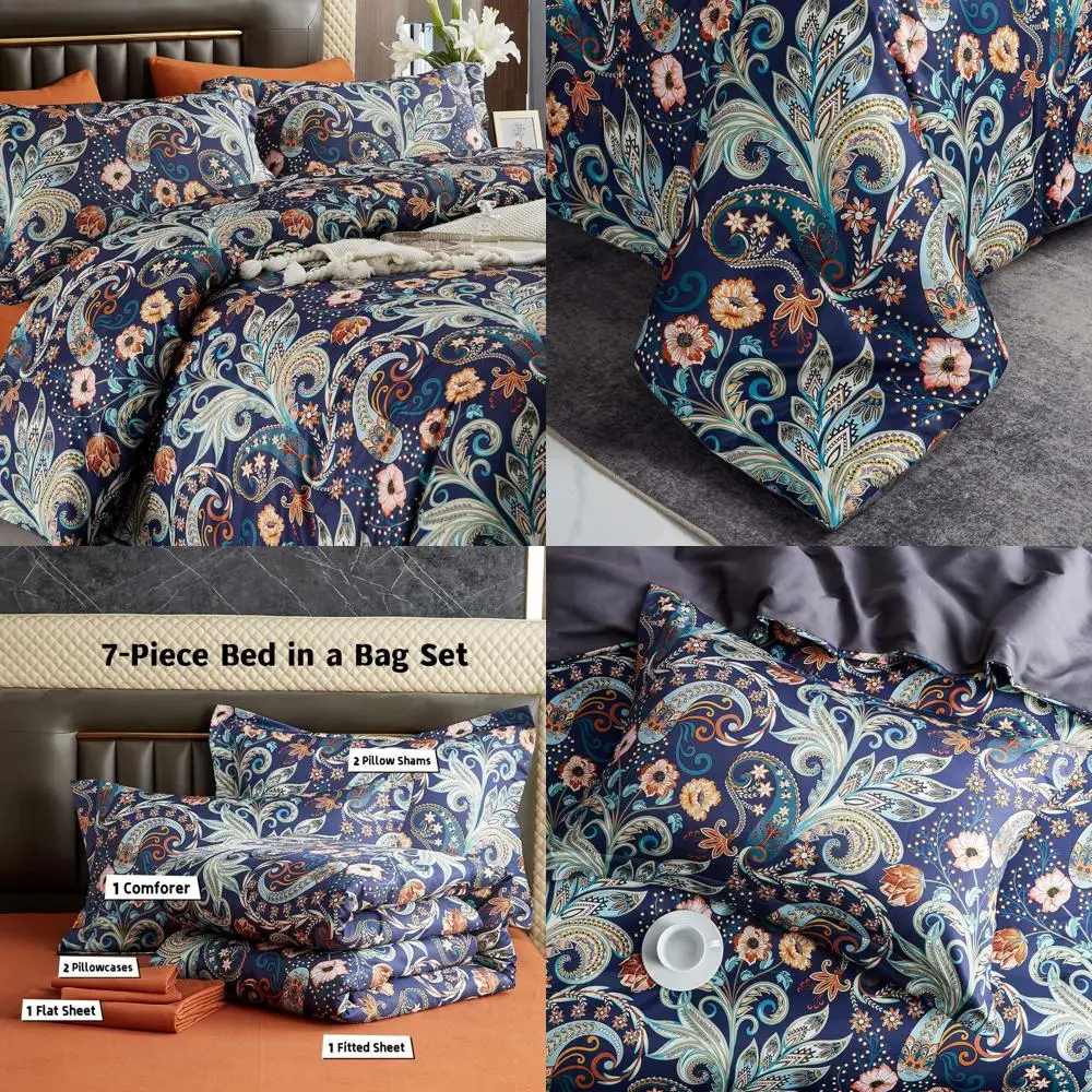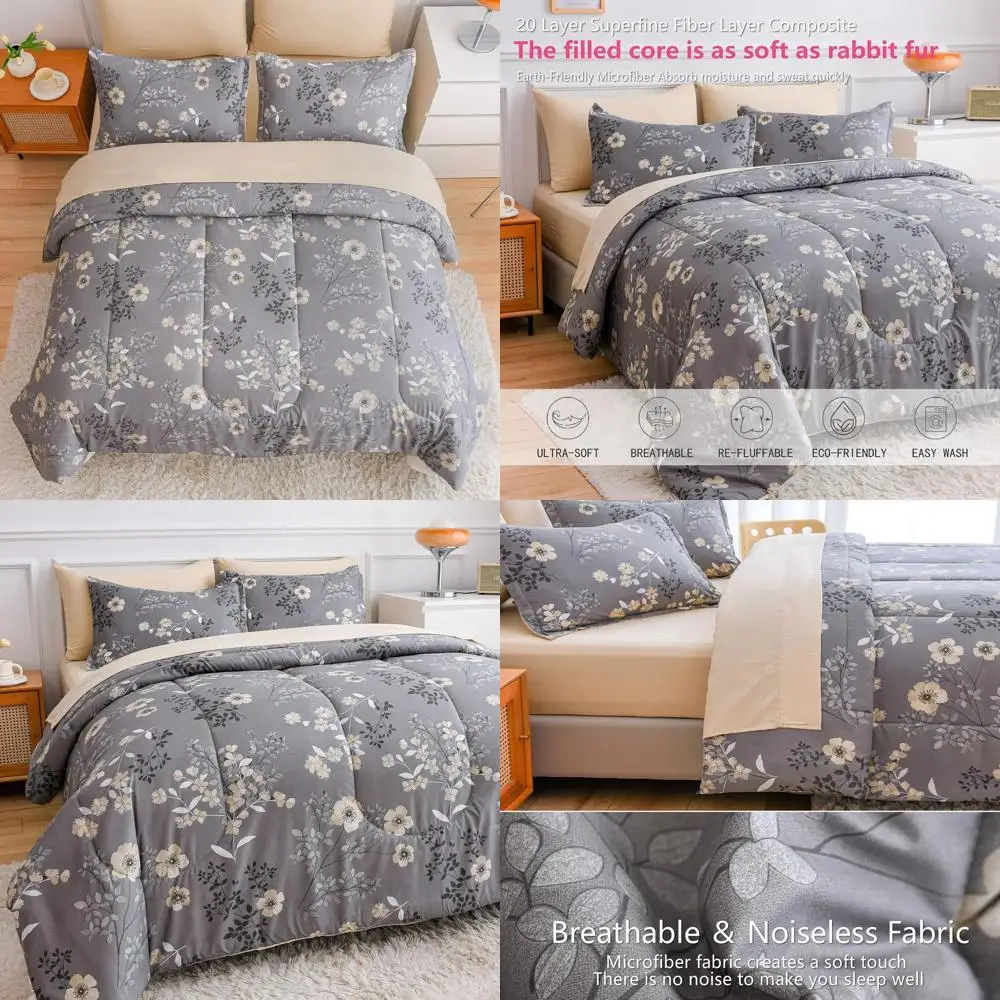 Grey 7-Piece Queen Bedding Set with Tree and Flower Print, Ultra Soft All-Season Comforter with Sheet Set $92.73
