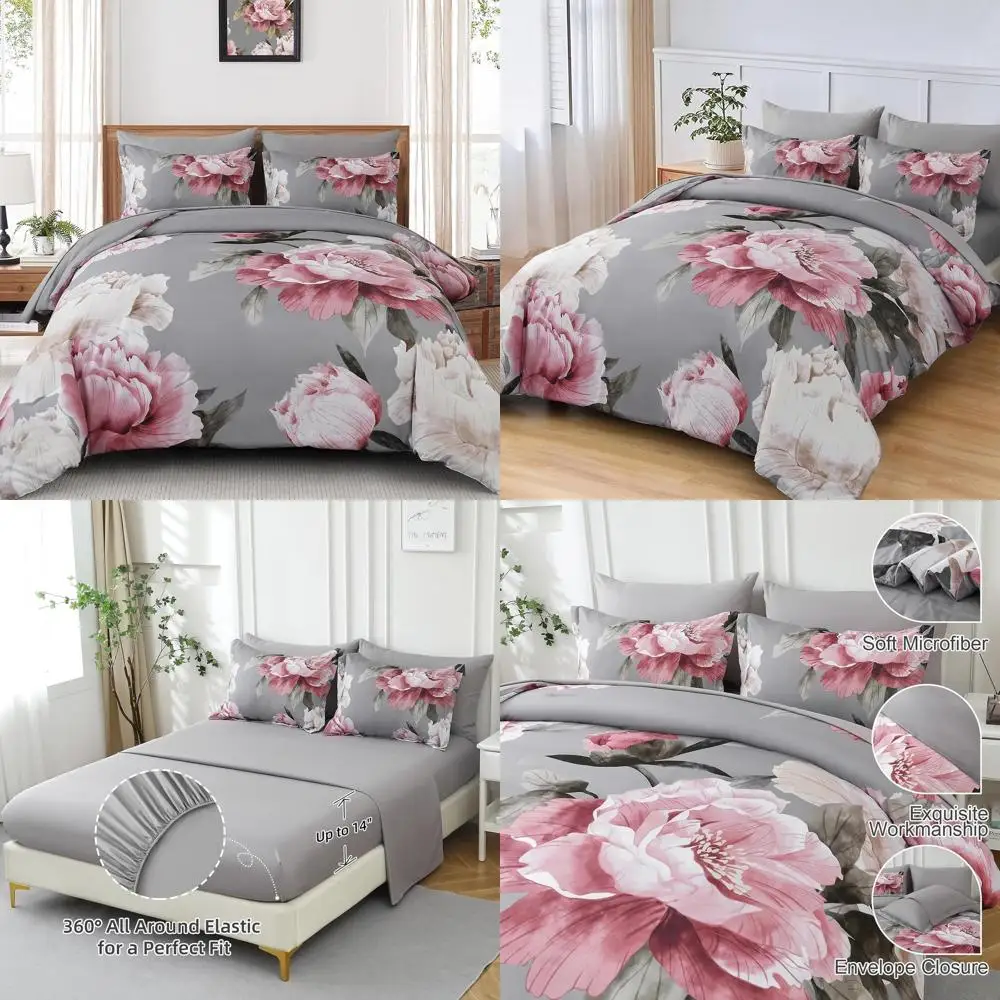 7-Piece Queen Floral Print Pink & Grey Comforter Set with Microfiber Sheets - All-Season Botanical Bedding $91.10