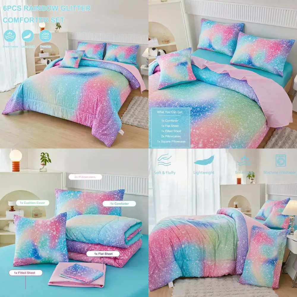 6-Piece Pink and Green Ombre Rainbow Tie-Dye Comforter Set for Girls - Glitter Teen Bedding in a Bag $91.10