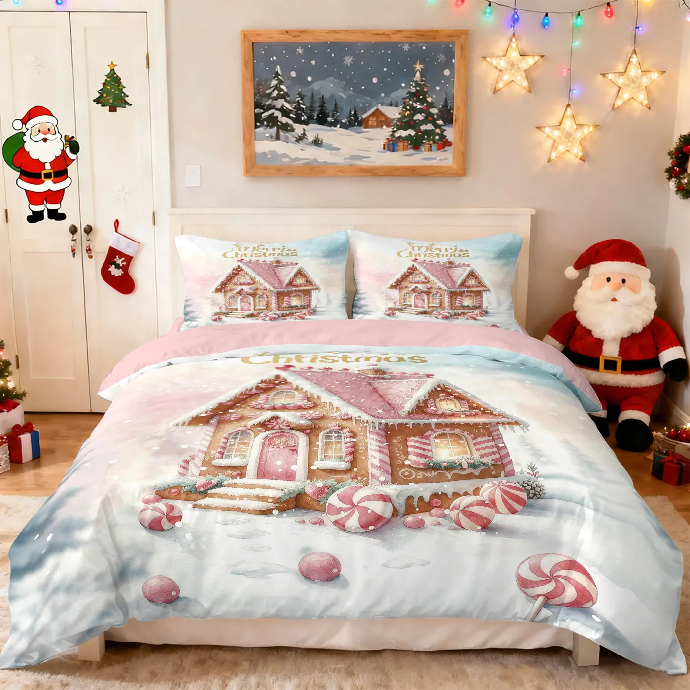 3pcs pink romantic Christmas cottage Merry Christmas print choreless bedding set multi size bedroom bedding holiday decoration $23.08