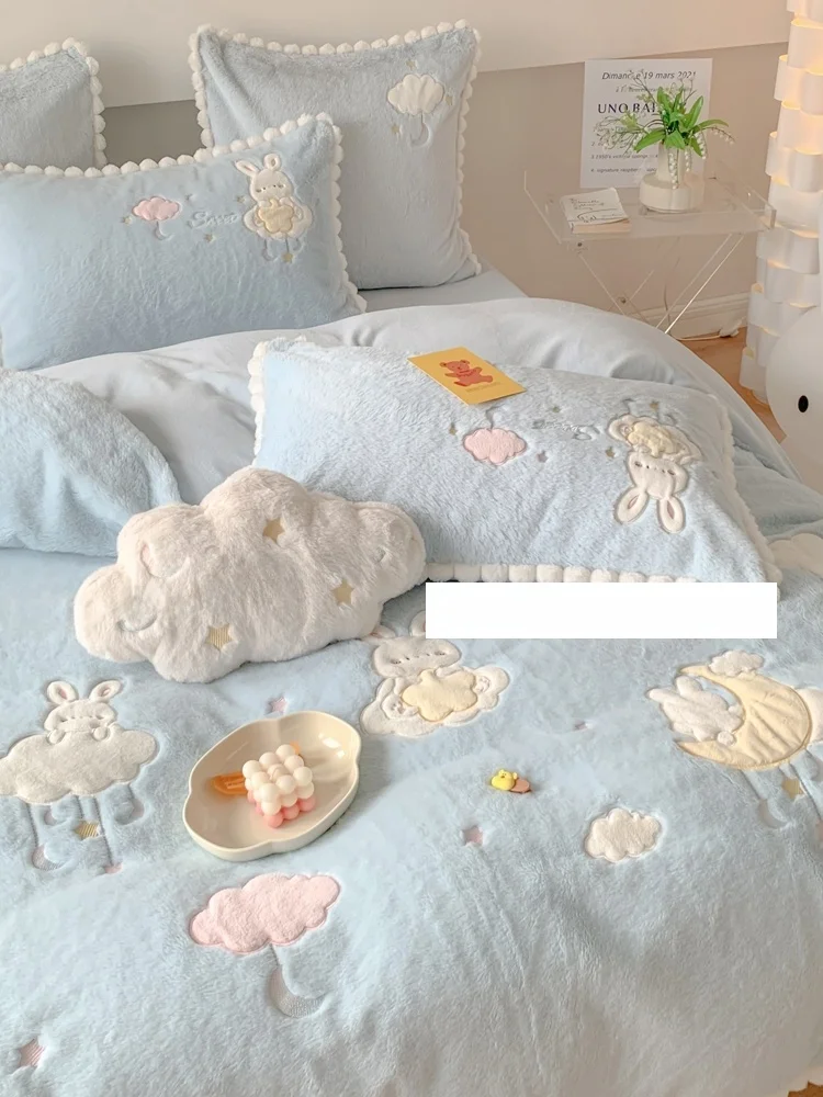 Thickened Warm Milk Velvet Bedding Set Cute Rabbit Embroidery Four Piece Set Coralline Velvet Duvet Cover Bedding for Autumn ... $136.73