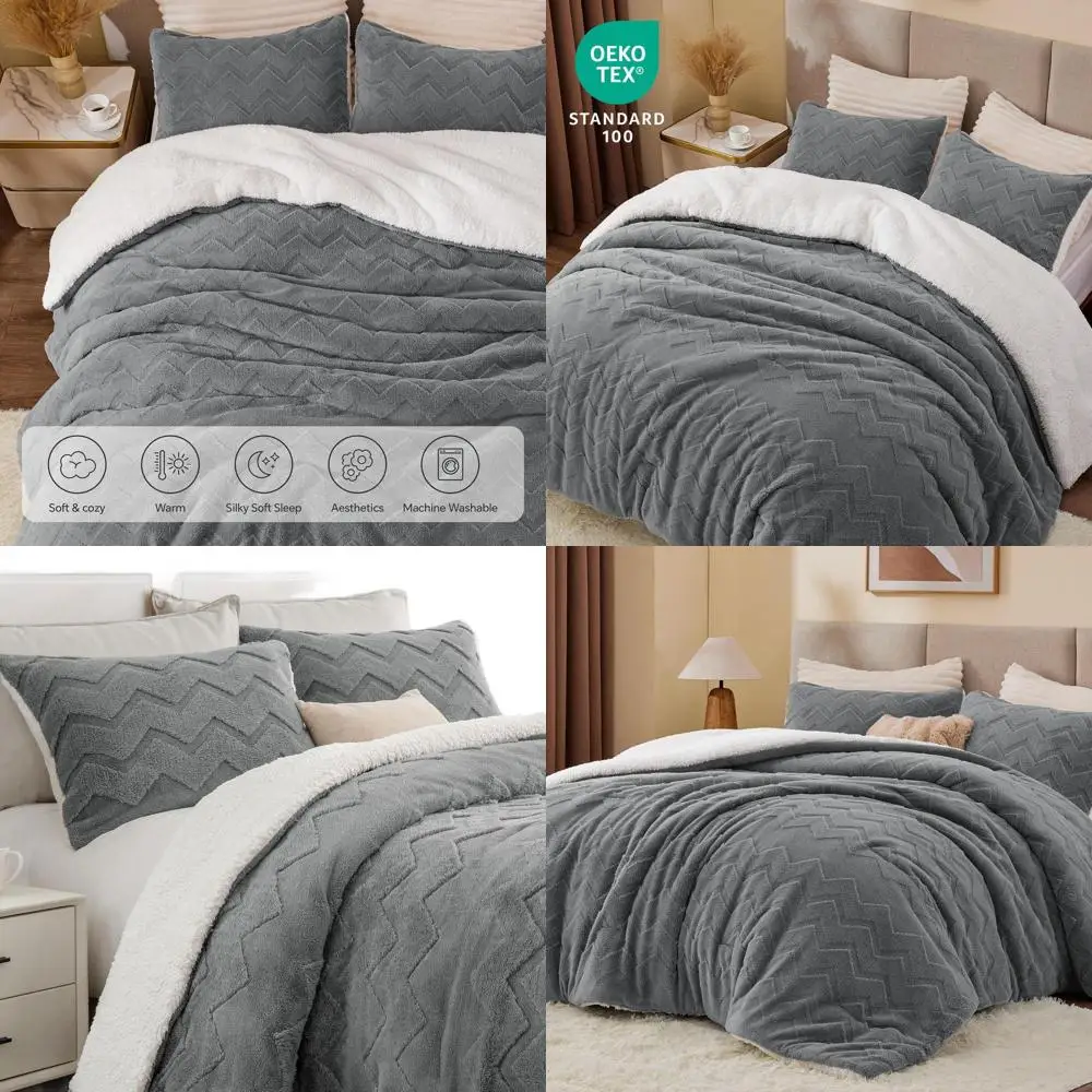 Luxurious Sherpa Grey Comforter Set for Queen Bed, Plush 3-Piece Bedding for Cozy Winter Nights $30.07