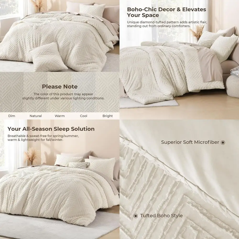 Beige 3-Piece Cream Tufted Boho Farmhouse Comforter Set, Lightweight Fluffy All-Season Bedding (104x90 Comforter, 2 Pillowcases) $25.60