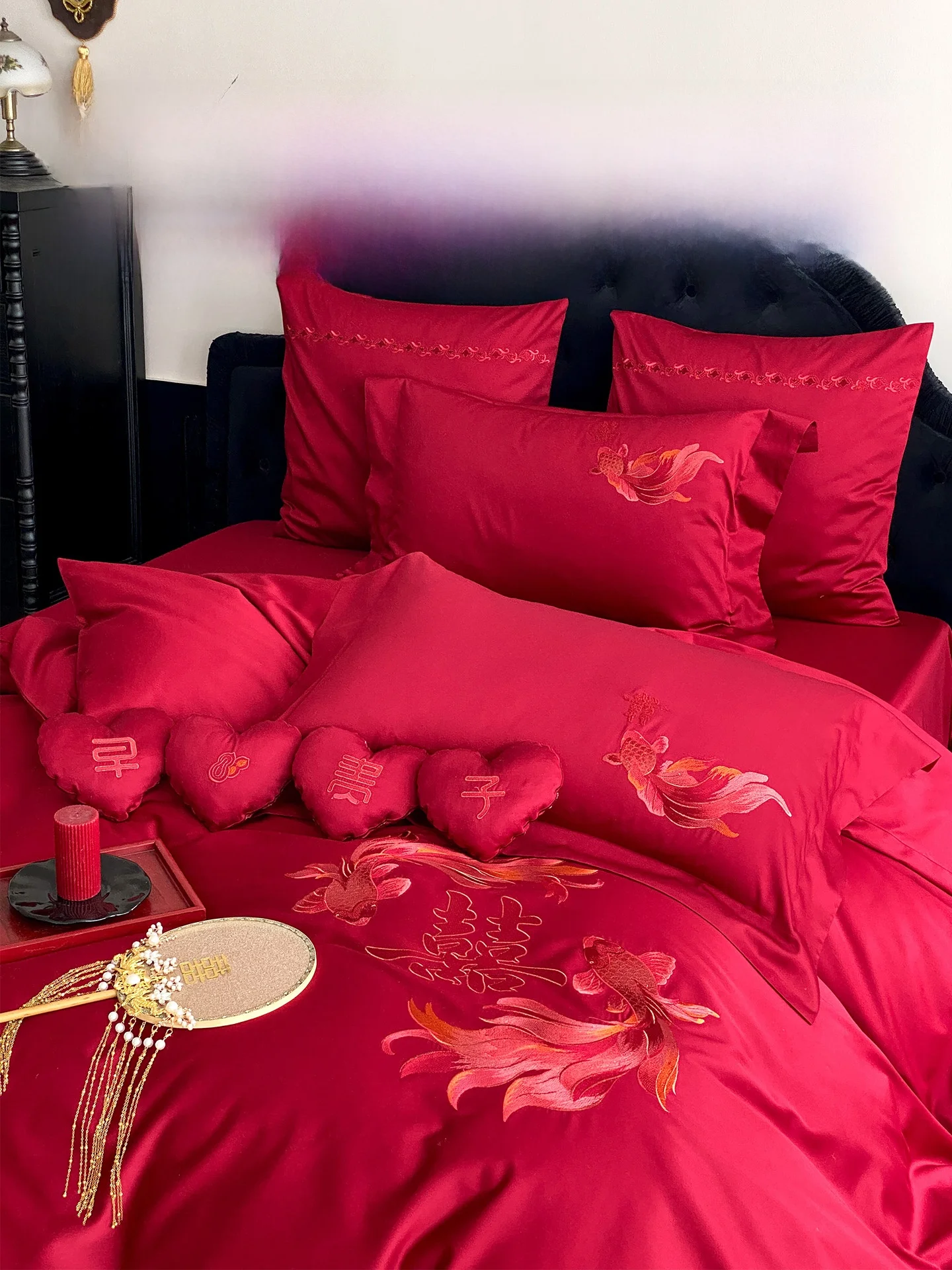Red Long Velvet Cotton Wedding Bedding Set Early Fortune Carp Embroidery Pure Cotton Quilt Cover eet Bedding for Newlyweds $144.55
