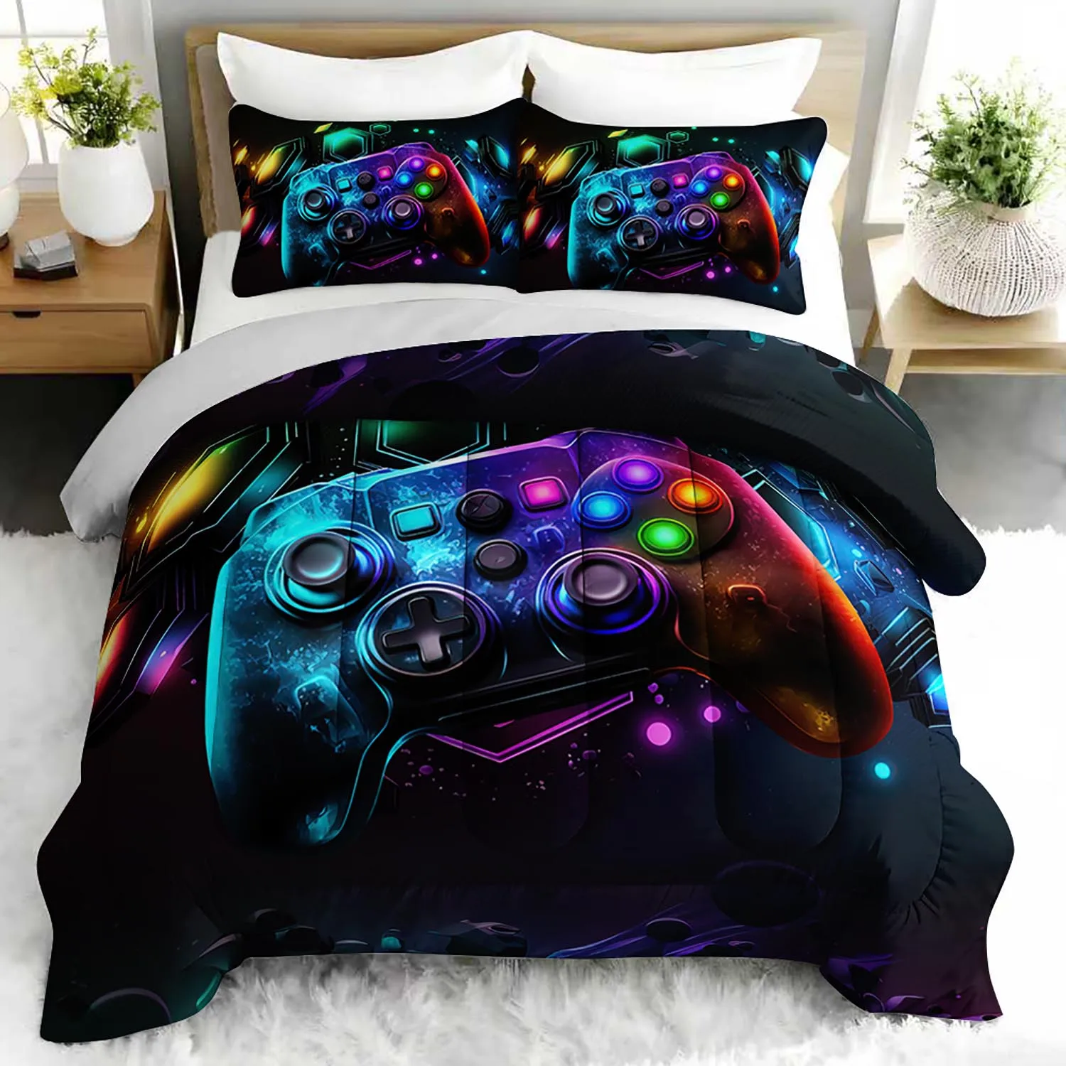 3PC Video Game Gamer Bedding Set Gaming Duvet Comforter Set with 2 Pillowcases for Bedroom Or Guest Room Decor Controller Design $15.28
