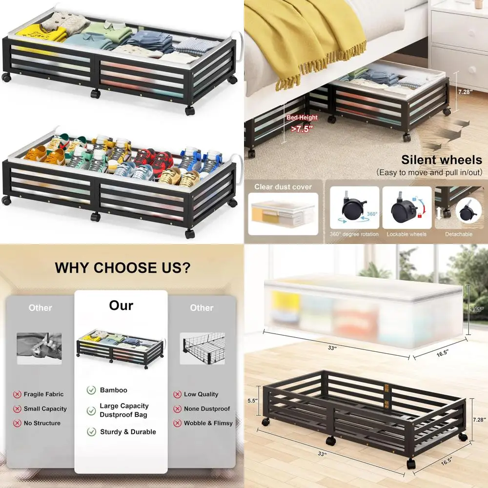 Large Bamboo Underbed Storage Boxes with Wheels - Stackable Containers for Shoes, Clothes, Books, and Bedding (2 Pack, Black) $130.34