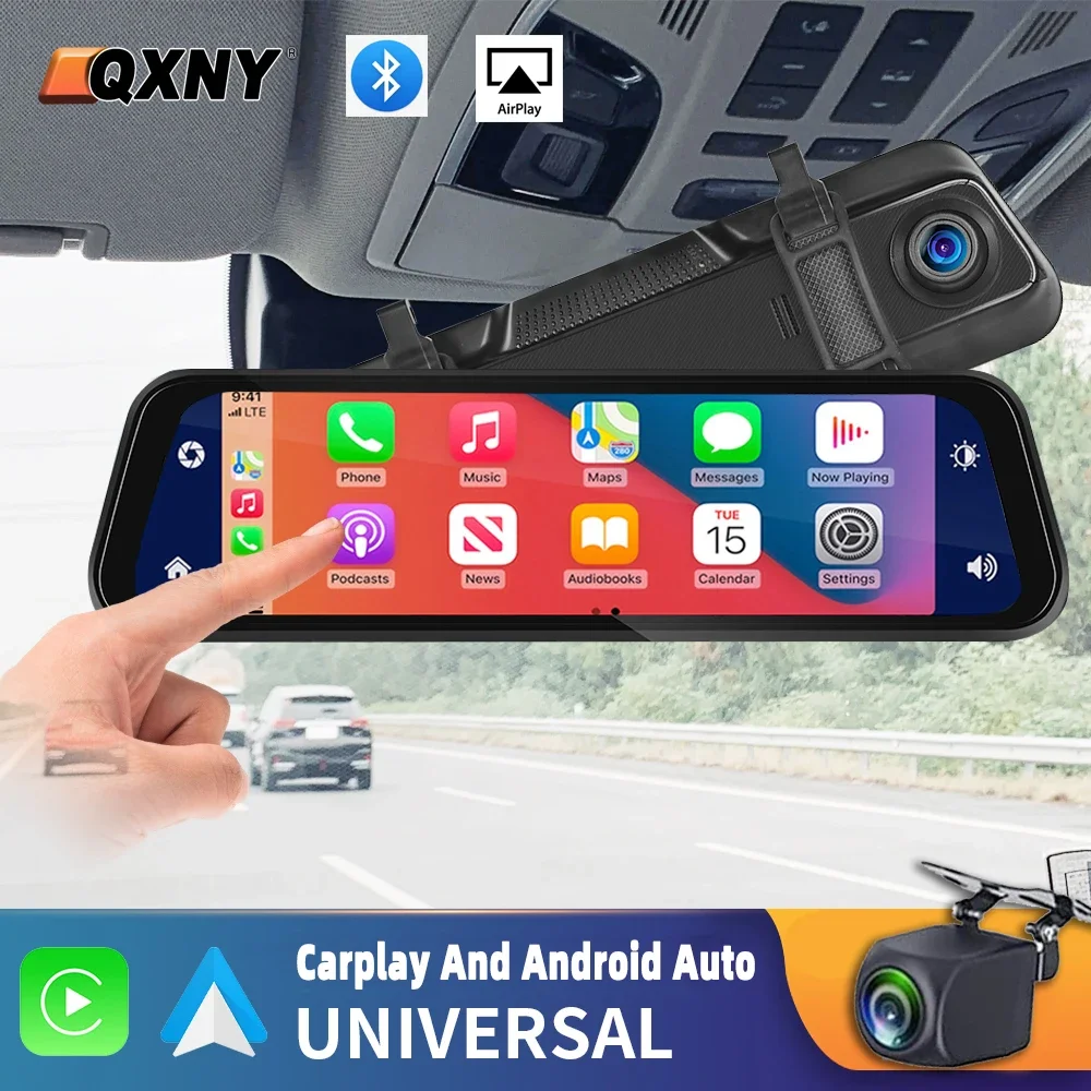 QXNY Carplay Dvr 9.66 Inch Touch Screen Stream Rear View Dash Cam Mirror Dual Camera Drive Recorder Android Auto Bluetooth $83.09