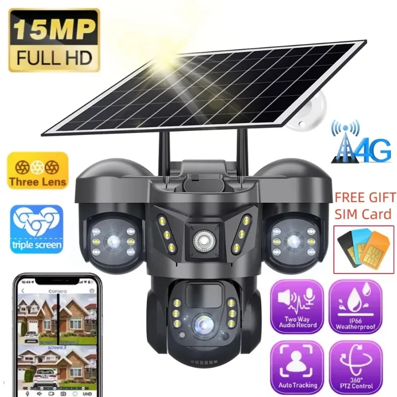 Solar Camera 4G Sim Card 15MP Outdoor 3 Lens 3 Screen PIR Human Detect Network IP Cameras Night Vision CCTV Security Protection $58.58