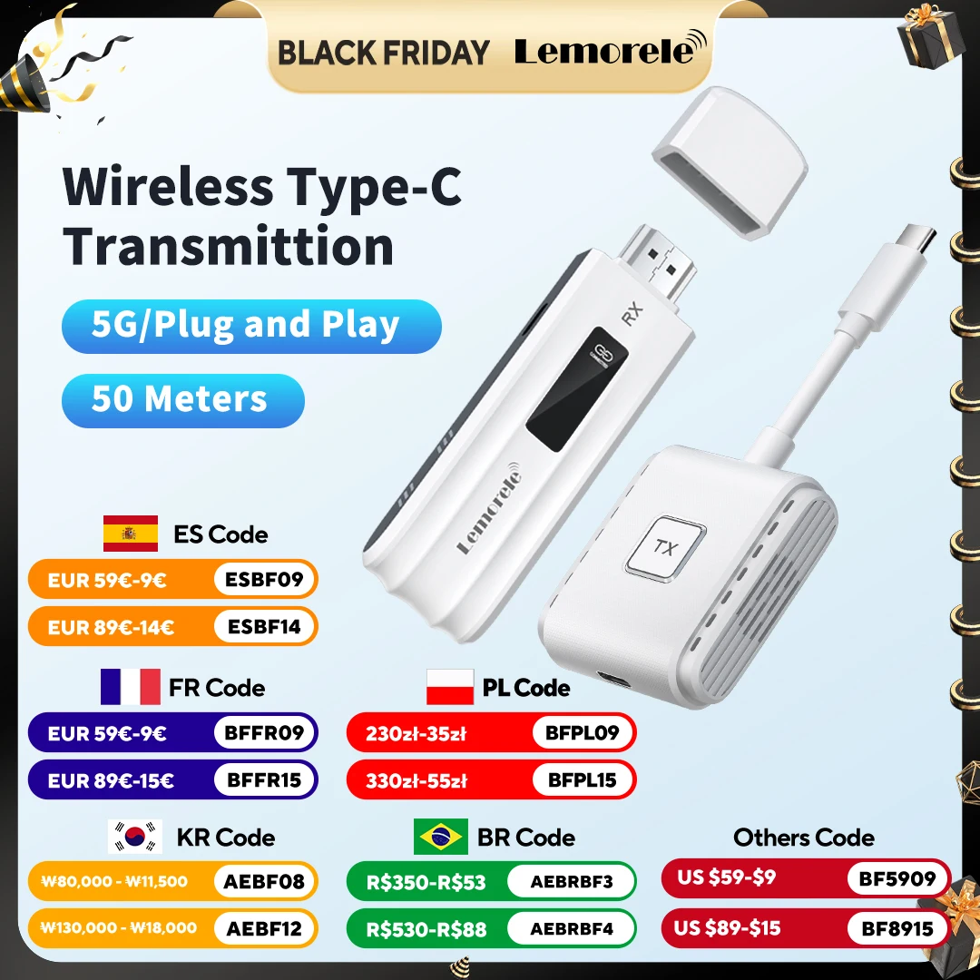 Lemorele 50m Type-C Wireless Video Transmitter HDMI Receiver Extender Kit 1080P Display Adapter for Camera Monitor PC To TV $23.76