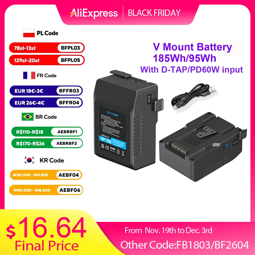 CITYORK V Mount Battery 185W BP-185 Lock Battery With Dual D-TAP and PD60W Fast Charge Input for SONY HDCAM XDCAM Digital Cinema $21.14
