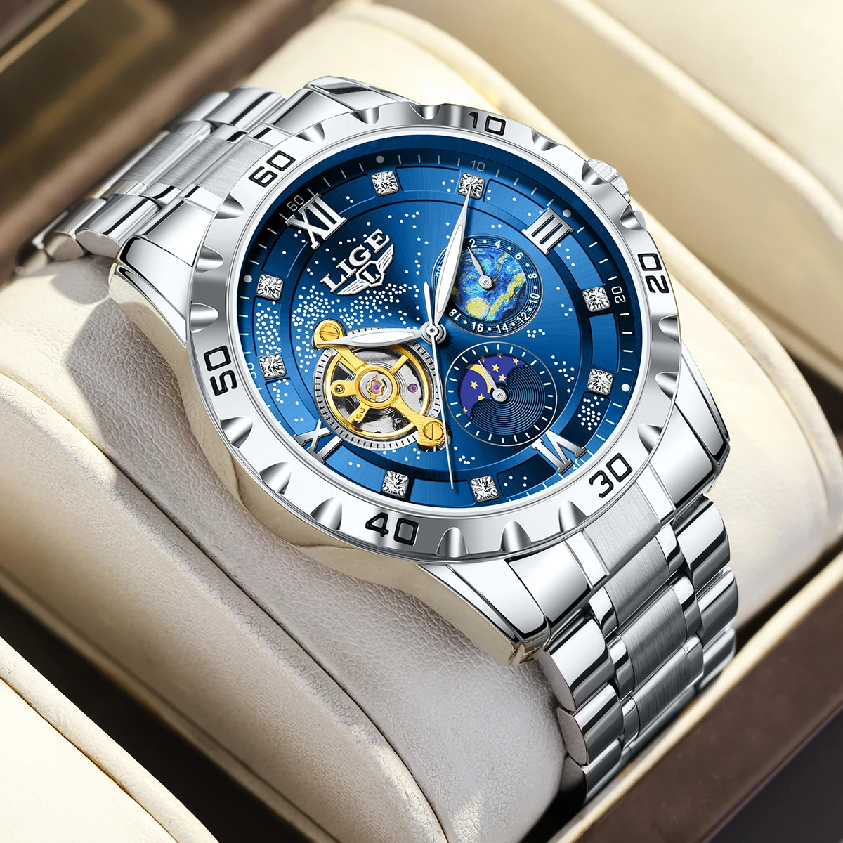 LIGE Mechanical Watches Men Moon Phase Phase Automatic Men Business Mechanical Wristwatch Waterproof The Starry Night Dial $38.10