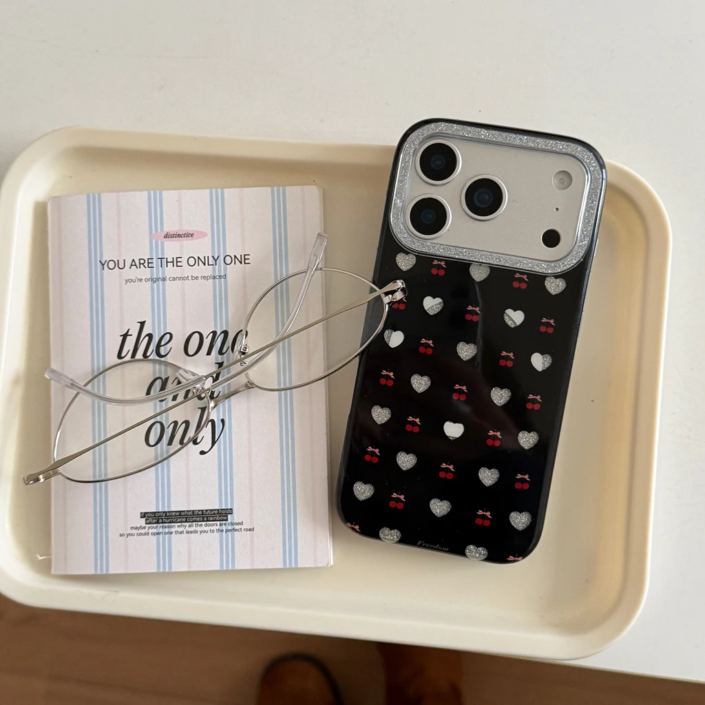 Fashion Black Love Cherry Bowknot Glitter Photo Frame Magnetic Wireless Proof Phone Cover Case for iPhone 17 16 15 14 Pro Max $8.33