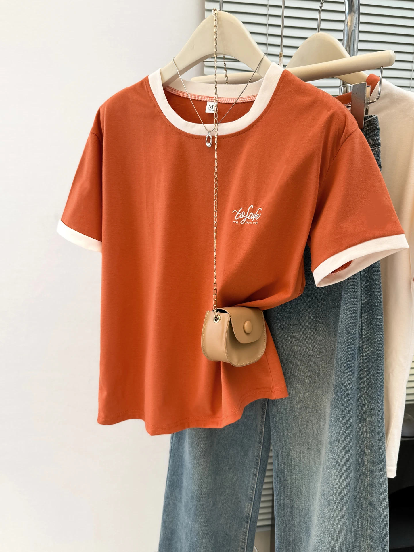 Korean Style Loose Women's Short Sleeve T-Shirt Embroidered Half Sleeve Summer Fashionable Base Shirt Color Block Trendy Top $17.47