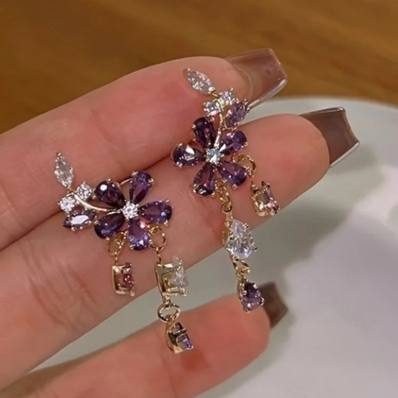 French Exquisite Purple Zircon Flower Earrings for Women's Elegant Niche Vintage High-end Versatile Jewelry Party Gift $4.01
