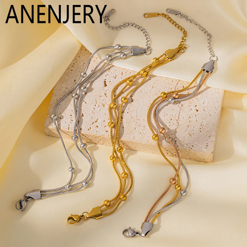 ANENJERY 316L Stainless Steel Three Layer Lucky Beads Bracelet for Women Men Ins Personality Jewelry Gift Wholesale $1.21